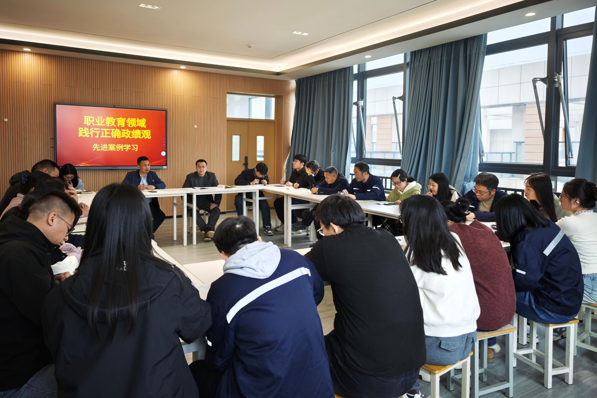 结合学院自身实践,会议重点围绕支部“笃行先锋”党建品牌建设,对照先进案例开展交流研讨。党员们结合自身教学、实训、学生管理等岗位实际,畅谈学习体会,对标案例找差距、定方向。大家一致认为,职业教育领域的正确政绩观,就是摒弃形式主义、不务虚功,把功夫下在人才培养、技能传承、服务产业上,既要做好看得见的“显功”,更要做好打基础、利长远的“潜功”。
