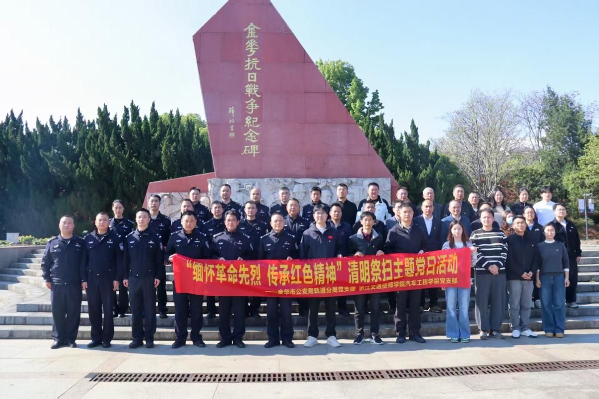 为铭记革命先烈的丰功伟绩,弘扬爱国主义精神,进一步增强党员干部的党性修养与使命担当,深化警校共建内涵,4月1日下午,汽车工程学院党支部联合金华市公安局轨道分局党支部,赴金华清风公园抗日战争纪念碑开展“缅怀革命先烈 传承红色基因”清明祭扫主题党日活动。学校党委委员、副校长叶智勇,汽车工程学院党支部书记包国勇,金华市公安局轨道分局政委何秀忠及双方党员同志共计43人参加活动。