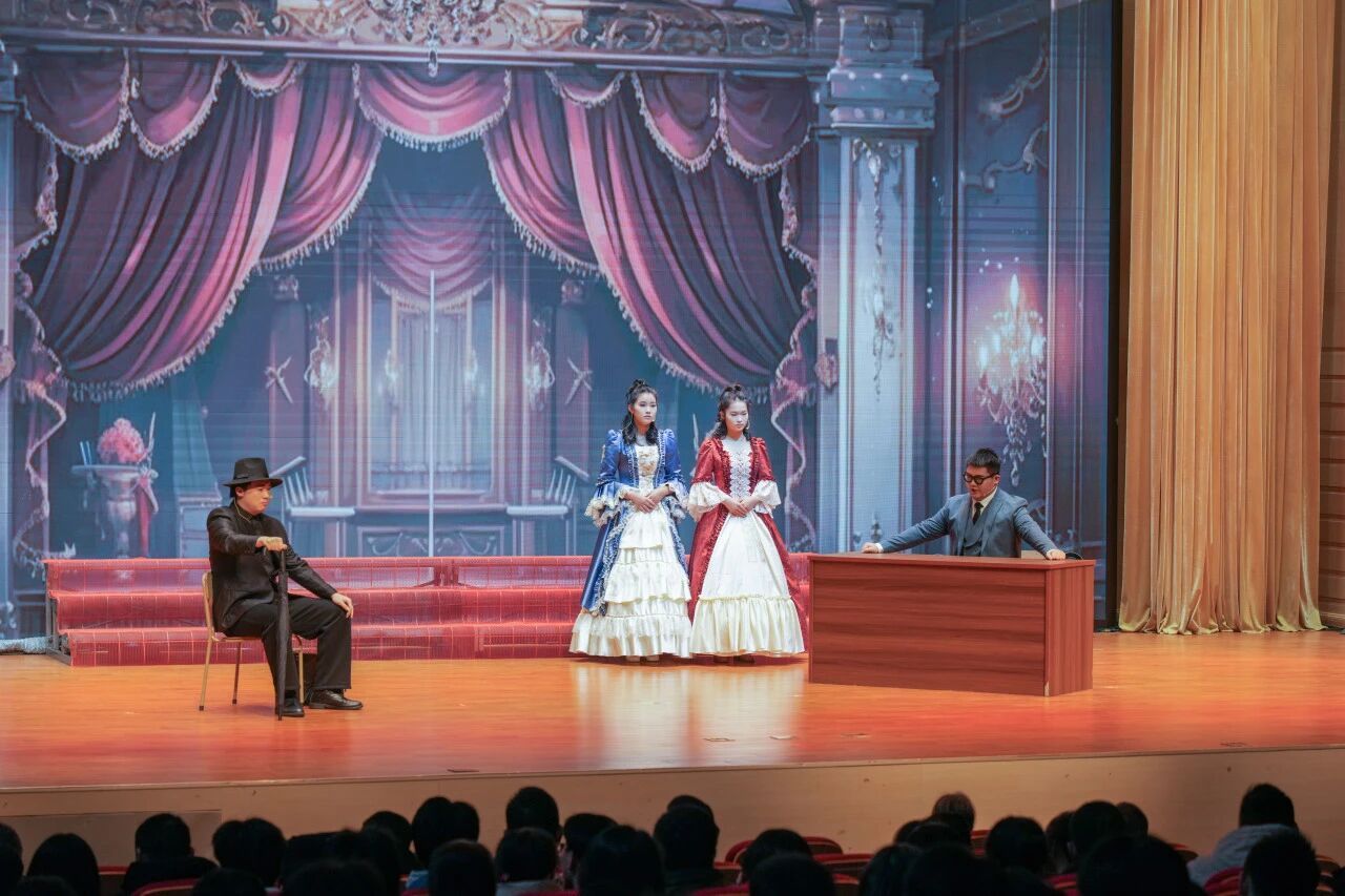 汽车工程学院、运输管理学院、机电工程学院与人文学院师生共同演绎的《千万别闹出什么乱子》(改编自《装在套子里的人》),以荒诞又真实的表演,引发师生对“突破束缚、拥抱自由”的深度思考。