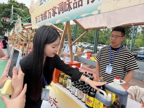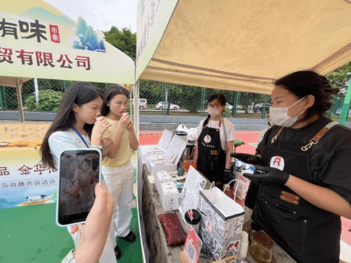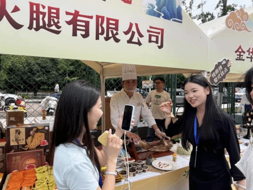 现场设置了游园会、游戏打卡区和美食体验区,主播们通过“美食寻宝”“限时秒杀”“互动抽奖”等创新形式,将金华特色农产品的推介融入趣味活动中,吸引了大批师生驻足参与。在美食体验区,现烤的金华酥饼香气四溢,火腿切片展示让观众直观感受“浙产好食品”的独特魅力。