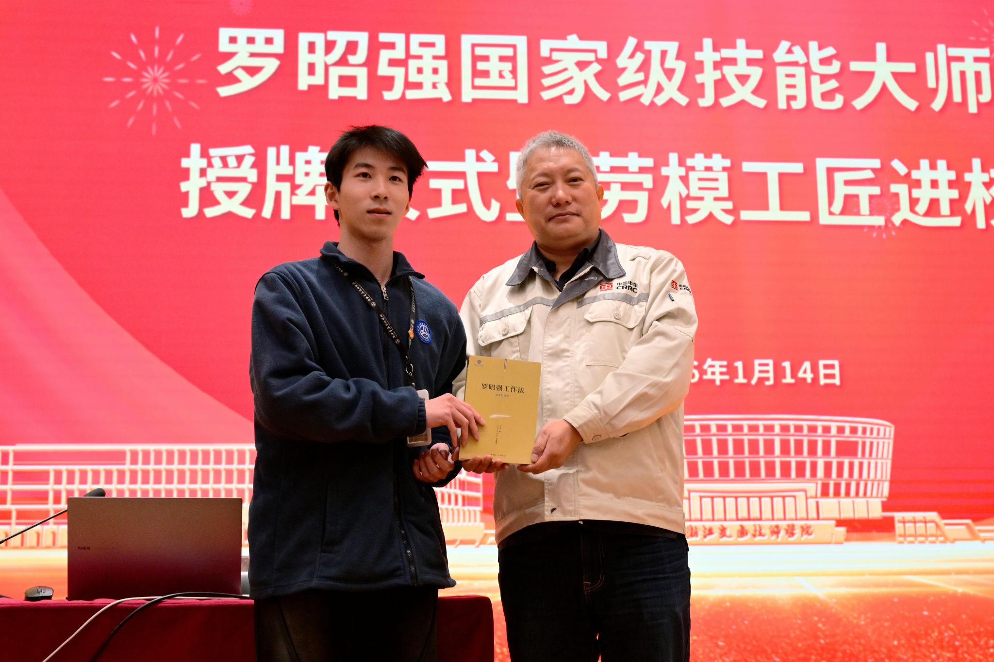 在全场热烈的掌声中,罗昭强国家级技能大师工作室授牌仪式正式举行。涂晓嫔校长为工作室授牌,罗昭强大师郑重接牌。这金光闪闪的牌匾,既承载着大师对学校的期望,更凝聚着学校为党育人、为国育才的使命担当。”
