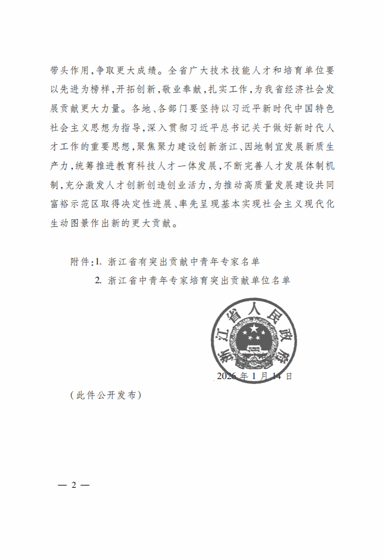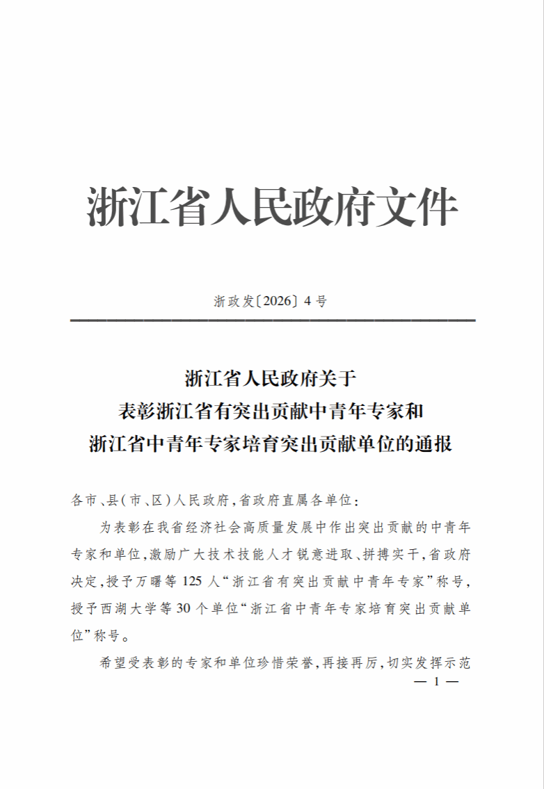 近日,浙江省人民政府发布《关于表彰浙江省有突出贡献中青年专家和浙江省中青年专家培育突出贡献单位的通报》(浙政发〔2026〕4号),表彰在浙江省经济社会高质量发展中作出突出贡献的中青年专家和单位。我校凭借在技能人才培育工作方面的扎实成效,荣获 “浙江省中青年专家培育突出贡献单位” 称号,成为全省职业院校中唯一获此殊荣的单位!