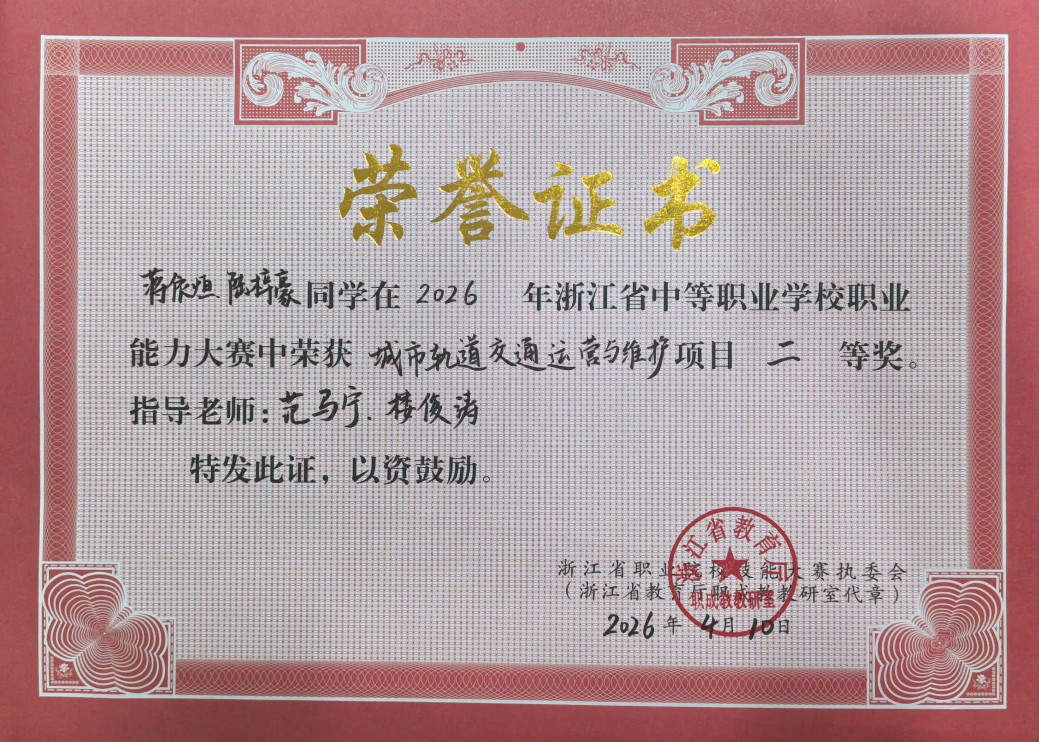 我校蒋依烜、陆梓豪两位同学凭借过硬的专业技能、默契的团队配合一路过关斩将,以全省第二名的成绩荣获该赛项二等奖,顺利拿到2026年世界职业院校技能大赛“轨道交通运输”赛道的入场券。