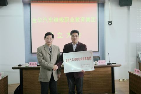 会上,金华市教育局何耀明副局长向学院唐锡军院长授“金华汽车维修职业教育集团”铜牌。学院作为集团理事长单位与各会员单位代表签约。