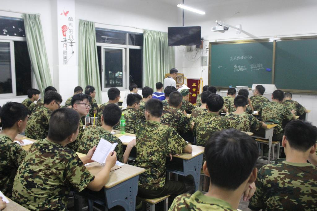 晚自习开始,各班的教官对接下来的正式训练提出几点要求,希望同学们在遵守军训纪律的同时,也要注意自身的安全,然后教官带领大家开始唱军歌,歌声嘹亮,唱响整个校园。教官离开后,由我们的班主任和班助带领大家进行入学教育,组织新生认真学习《学生手册》,主要以校纪校规、安全、心理健康、文明等方面为主的日常生活学习习惯养成教育。