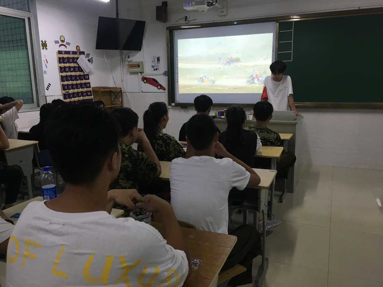 9月4日晚,在结束了一天的训练后,二营二连在育才楼303教室观看了学院“巴哈视频”纪录片。在视频中,巴哈赛车蓦地出发,一路驰骋沙土、逾越乱石,引擎轰鸣、泥巴飞溅,勇往直前毫无畏惧,最终夺得桂冠,看得同学们心潮澎湃。随着纪录片的推进,当同学们了解到这是我院学生自行组成的车队,他们有一个响亮的名字“金鹰车队”。从车子的设计到研发再到实战都是同学们亲历亲为,不禁发出由衷的感叹,真是太厉害了!从2016到2018,从优秀奖到一等奖,三年的蛰伏、三年的历练,这需要多少意志的磨练,需要多少汗水的付出,对于此刻正在军训的我们,何尝不是这样呢,“不经历风雨,怎能见彩虹,没有人会随随便便成功”。班主任唐奕扬老师希望同学们都能发扬巴哈这种不怕苦累永不言败勇于进取的精神,无论是在当下的军训中还是日后的学习生活中,都时刻激励同学们不断向前、争取卓越。(汽车服务系 唐奕扬)
