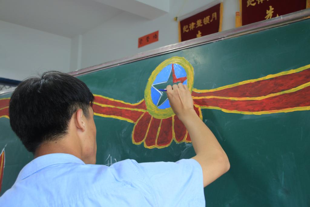 在紧张忙碌的军训之余,各班新生在班主任的指导下,充分利用空闲时间,绘制黑板报。为了9月10日的黑板报评比大赛,各连新生画了又涂,涂了又画,他们忙碌的身影形成了教室中一道亮丽的风景线。他们将自身军训的经历融合在了图画中,把对军训的,感悟记录在了文字中描绘在黑板上,充满了真情实感,使各连的新生们深受鼓舞。