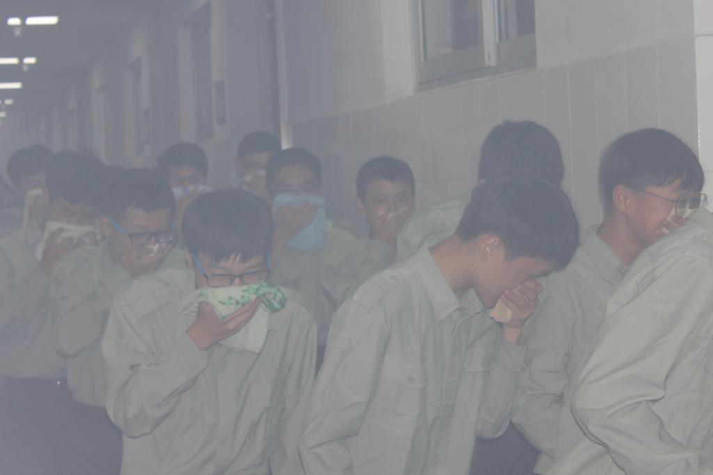随着一阵长鸣的警报声响起,消防演练正式开始,同学们首先用准备好的湿毛巾捂住口鼻,在教官的指挥引导下,按照要求,班主任带领大家快速、安全的撤离到学校操场的安全地带,整个疏散过程井然有序进行,达到预期效果。