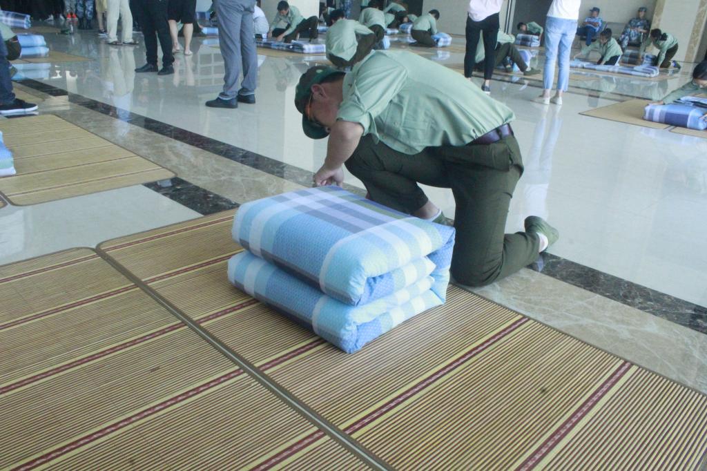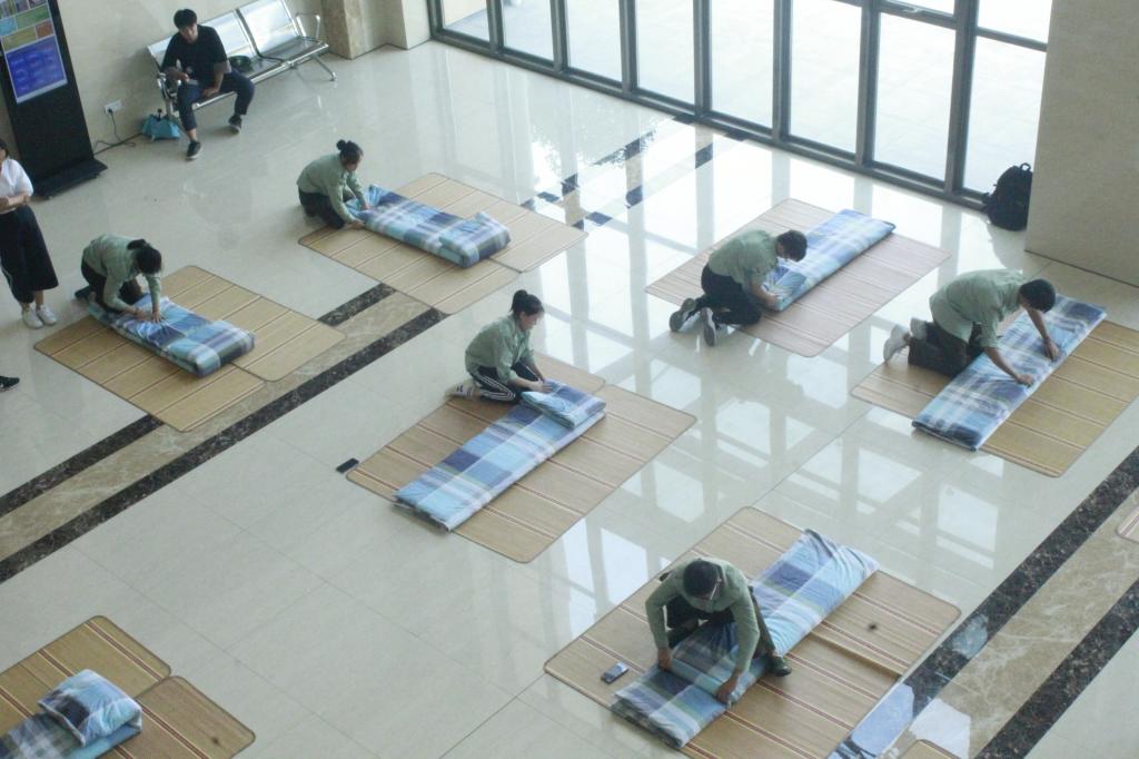 叠被子大赛即将来临,为备战大赛,检验新生军训成果,提高其自立自强意识,9月9日中午,基础部组织新生于精艺楼大厅开展叠被子初赛。