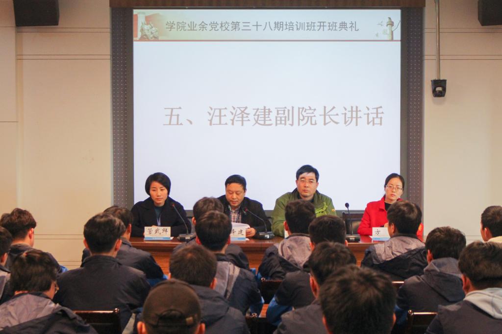 11月27日,我院第三十八期业余党校开班典礼在综合楼三楼视频会议室举行。学院副院长、业余党校校长汪泽建,学生处处长、业余党校副校长叶智勇,党政办副主任管武鲜、业余党校培训班班主任方科出席开班典礼,典礼由党政办副主任管武鲜主持。