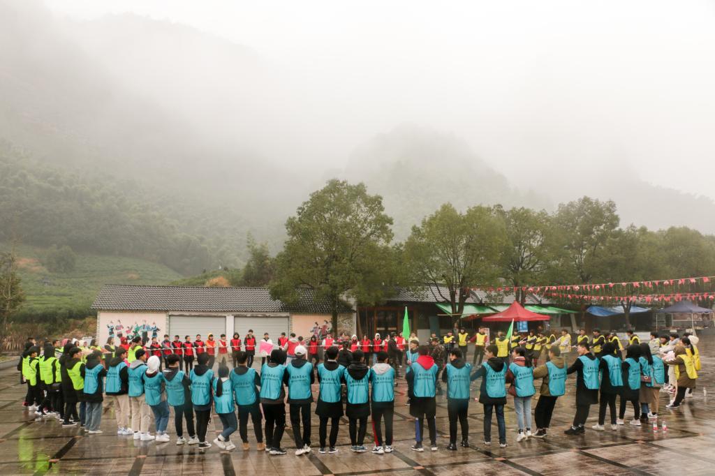 经过1小时车程,同学们稍做休息,本次活动的教官们带领着大家做起了热身运动。接着教官将同学们分成了四组进行游戏竞赛,幽默活泼的队名、队歌点燃了现场的气氛。雷区取水、活力圈绳、动感绳索……这几项素质拓展项目都需要共同协作、相互信任才能完成,同学们在一次又一次的失败中总结经验,互帮互助,齐心协力通过了重重考验,时间在欢声笑语中不知不觉溜走。下午,虽然天空下起了蒙蒙细雨,但依旧挡不住同学们游玩的热情,同学们撑着雨伞,穿上雨衣,兴致勃勃地向顶峰前进。