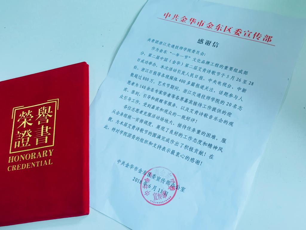 6月11日,中共金东区委专程给我院寄来一封感谢信。感谢我院对第二届中国(金华)·艾青诗歌节志愿活动的大力支持,感谢学院团委的积极组织。5月27日,由中国诗歌学会、北京大学中国诗歌研究院、中共金华市委宣传部、金华市金东区人民政府、金华市金义都市新区管委会主办的第二届中国(金华)·艾青诗歌节在艾青的故乡金东区畈田蒋村隆重开幕。本届诗歌节由中国诗歌学会、北京大学中国诗歌研究院、中共金华市委宣传部、金华市金东区人民政府、金华市金义都市新区管委会主办。