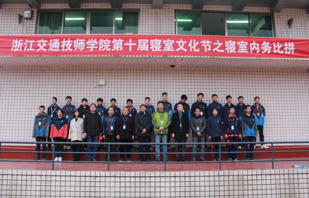 为加强精神文明宿舍建设,有效督促、激励广大同学营造良好的生活环境,养成良好的生活习惯,12月19日, 我院在操场举行“寝室文化节内务评比活动”学院副院长汪泽建,学生处处长叶智勇,经济贸易系学管主任陈春,机电系学管主任贺红光,汽车技术系学管主任金学文,基础部主任张震新担任评委,3号楼楼长周成英担任裁判。