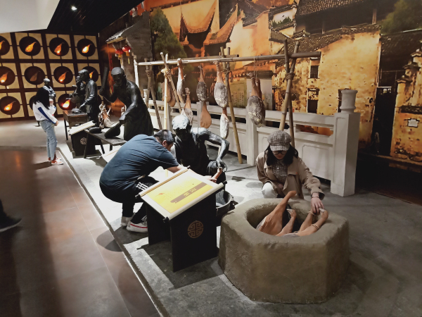 中国火腿博览馆就在金帆街上,参观过程中,同学们在一座座栩栩如生的石像与模型之下,感受火腿发展的历史,观察火腿制作的流程,看着一代代人用他们的勤劳与智慧,创造出那“色、香、味、益、形”五绝的国家非物质文化遗产——中国火腿。期间,同学们尝试去学习火腿制作的动作,根据文字的讲解,亲身模仿火腿制作的过程,之后背景墙文字的解释下,同学们更全面的了解到火腿从原材料的筛选到制作,更在其详细的介绍中体会到火腿的悠久历史。