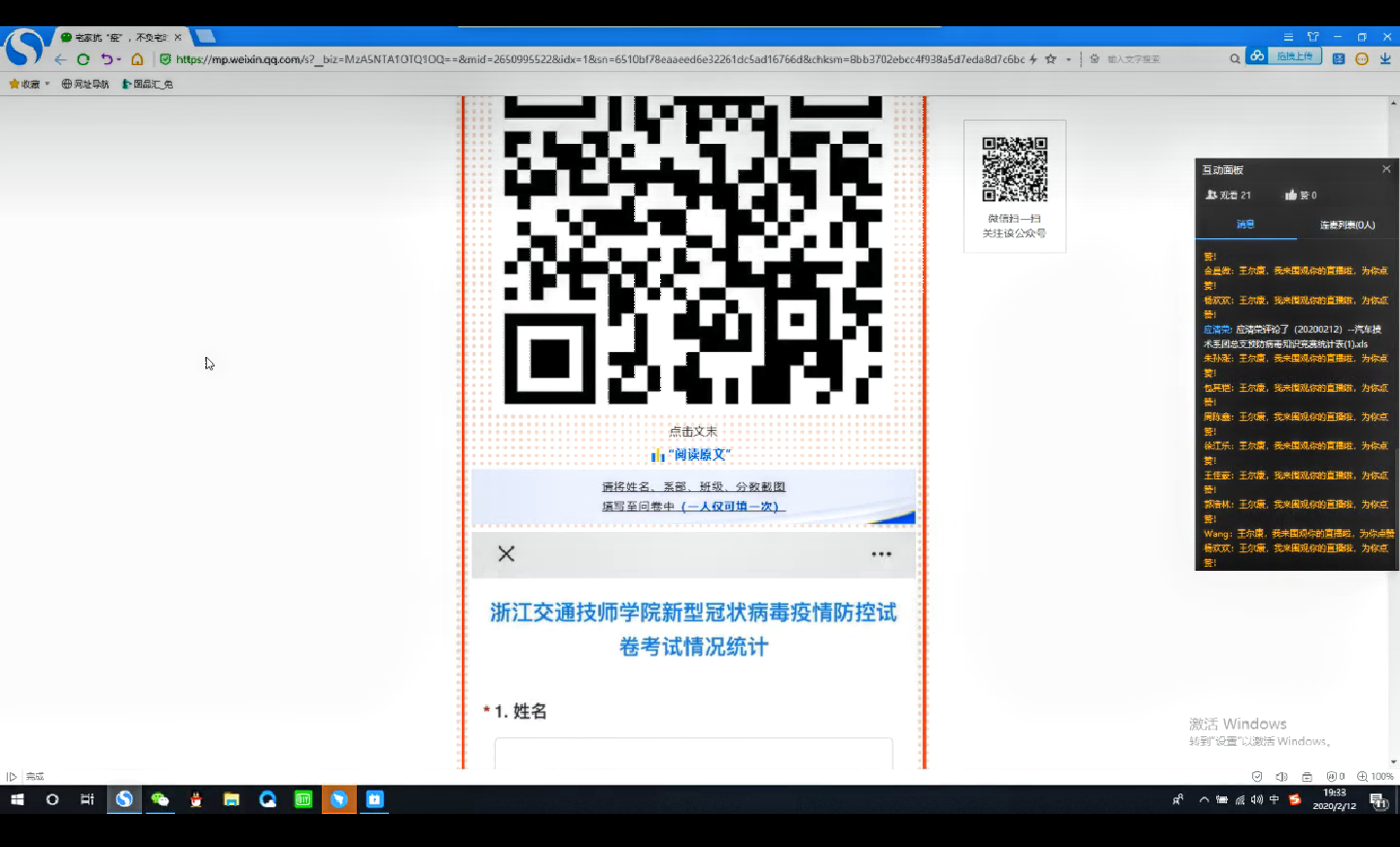 增强思想意识和提高认知水平,是做好新型冠状病毒肺炎的预防工作的“排头兵”。2月12日,在院团委的指导下,汽车技术系团总支组织开展了“预防新型冠状病毒肺炎”科普知识竞赛钉钉直播平台讲解活动。此次活动由团总支书记王尔康老师主讲,系部全体团支书参加了本次活动。