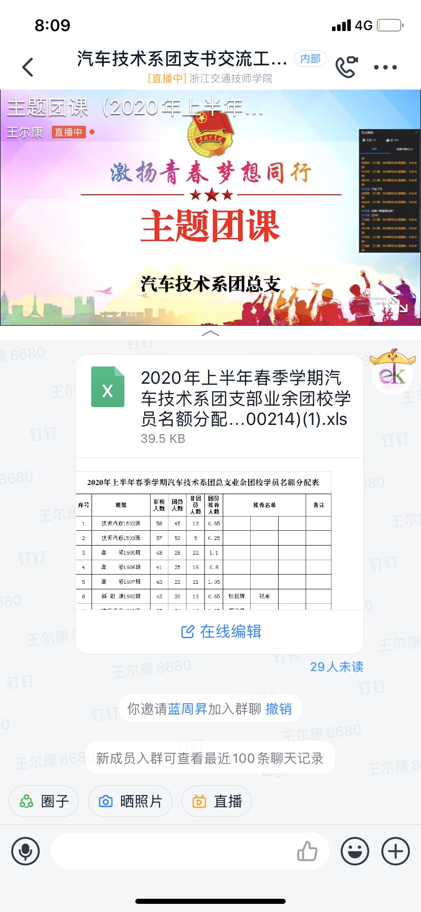 为了进一步加强学生共青团组织建设,增强学生对团组织认识和了解,2月15日,汽车技术系团总支在钉钉直播平台开展了一次以“激扬青春,梦想前行”为主题团课学习活动。此次主题团课由团总支书记王尔康老师主讲,系部全体团支书参加了本次活动。