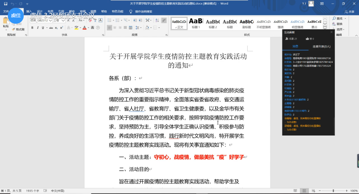 由于新型冠状病毒的存在,经贸团总支此次会议利用钉钉直播平台,很好地实现了线上工作同步和工作下达。会议由虞佳老师主持,20位优秀团干部参加,主要围绕着三个方面进行讨论。