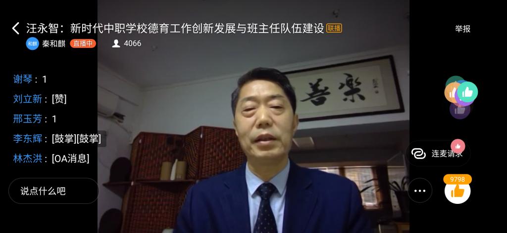 3.13日下午,中国职教学会德育工作委员会副主任汪永智教授做了主题为《新时代中职学校德育工作创新发展与班主任队伍建设》专题讲座,分享了优秀德育工作经验,详细的解读了德育工作的意义和总体要求,指出各中职学校在开展学生德育工作的过程中要突出时代主题,切实发挥思想政治课关键课程作用,强化教育引导和实践养成,加强组织保障,实现德育工作的创新实践。针对班主任队伍建设,他指出中职班主任使命光荣,责任重大,只有树立成为富有教育智慧的中职班主任的价值追求,通过多种途径着力提高教育、德育等理论与政治、政策、法规、文化与艺术素养等专业能力,成长为学生喜爱、家长满意、同行称赞、领导奖励的成长型班主任,才能在促进学生成人成才成功中做出更大贡献。