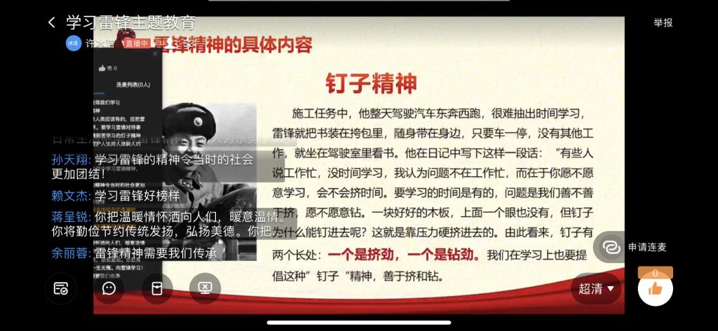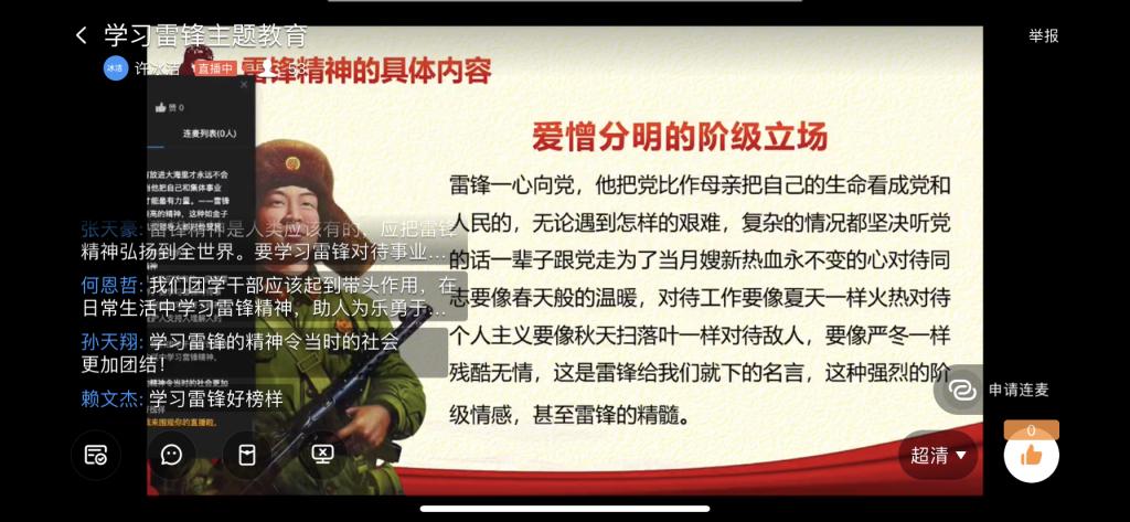 本次活动通过在线课堂的形式开展,由团总支许冰洁老师主讲,她以精美的PPT课件为载体,向同学们介绍雷锋的生平和雷锋日的由来,详细讲解了雷锋精神的具体内容,深入剖析了新时代雷锋精神的具体含义。同时,联系近期抗击疫情第一线的奋斗者,点出他们身上的雷锋精神,并通过网络视频举例现今具有雷锋精神的时代楷模,加深学生对雷锋精神的理解,指引学生“向雷锋同志学习”。同学们在课上积极发言,纷纷表示会积极践行雷锋精神,争做新时代文明青年。