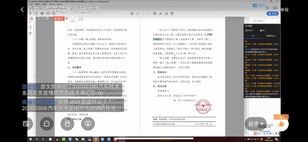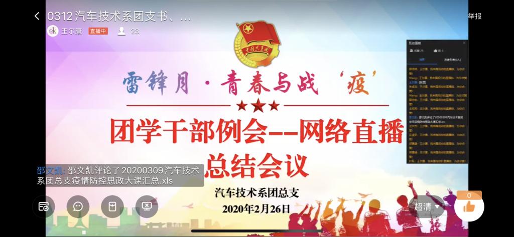 为下一季度团总支工作的有效开展,培养一支素质高、能力强、业务精的团学干部队伍,3月12日,汽车技术系团总支2020年团学干部第一次工作总结会议在钉钉直播平台拉开帷幕。本次会议旨在总结三月份团学工作的进展,归纳团总支第一季度的工作情况,完善线上材料报送,部署“党团知识竞赛”相关材料活动材料等事宜。汽车技术系全体青年学生干部参加了本次会议,会议由团总支书记王尔康老师主持。