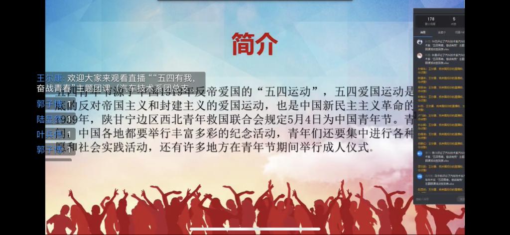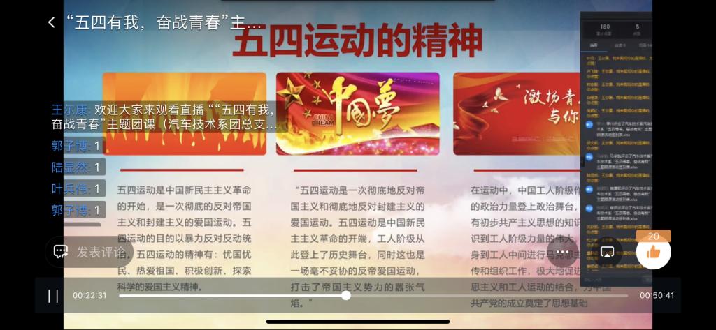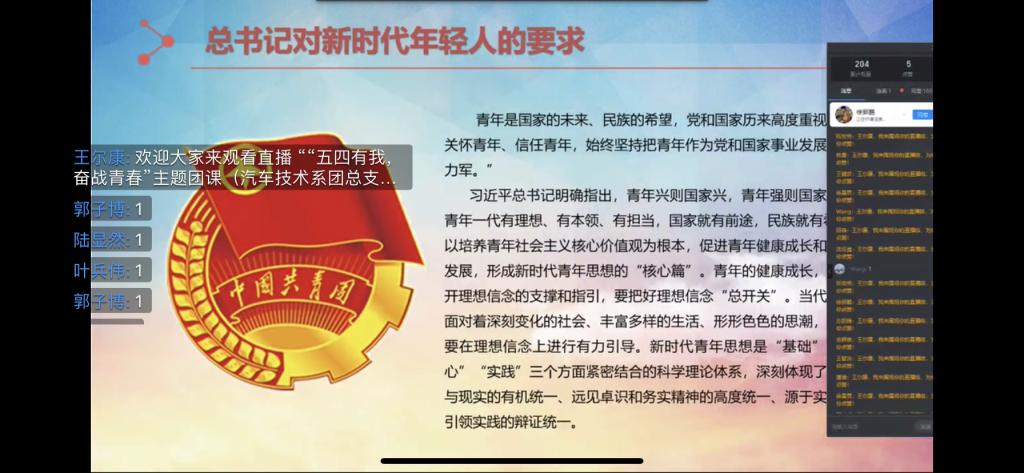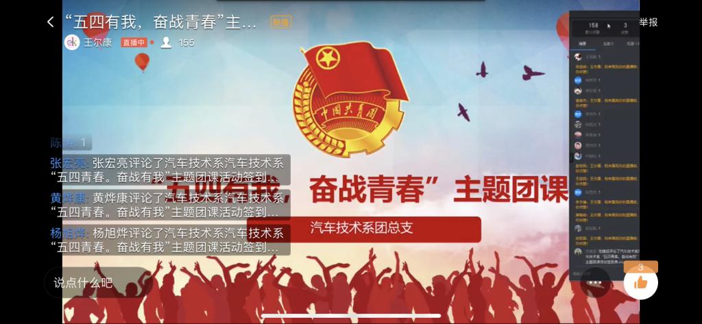 为了弘扬“五四”精神,纪念五四爱国运动101周年,放飞青春梦想,激励团员青年自觉担负起时代赋予的光荣使命,不断创造新的青春业绩,进一步营造健康积极向上的校园文化氛围,实现和谐校园、和谐社会而努力奋斗,5月4日,汽车技术系团总支利用五一放假时间组织全体青年团员利用钉钉直播平台开展了五四青年节主题微团课活动。活动由团总支书记王尔康老师主持,系部全体青年团员参加了此次活动。