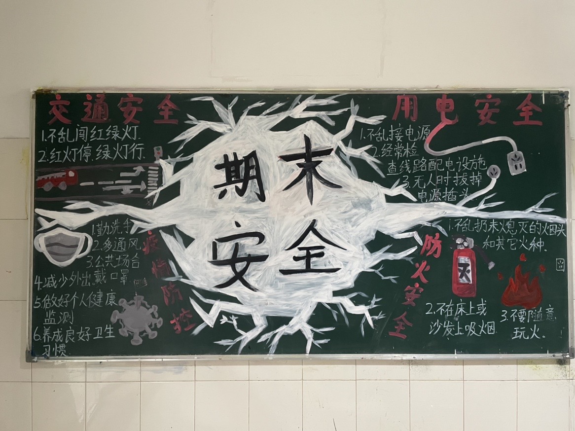 安全重于泰山,安全是一切工作的重中之重。为了更好地做好学院安全工作,临近学期期末,强化学生安全意识,进一步加强寝室安全文化建设,促使学生更加健康成长,学生处组织各公寓楼用黑板报的形式对学生进行安全宣传教育。