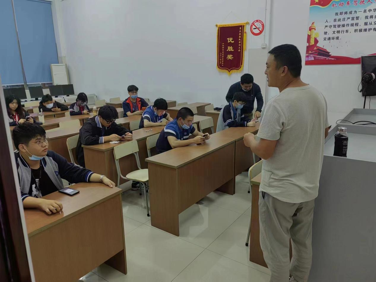 晚上7点的6号楼教室竟然灯火通明,本以为是教练员在休息,结果发现是教练员为了提高学生科目一考试的合格率,利用晚自习集中学生进行理论学习辅导。