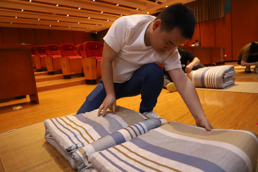 第三环节的叠被子比赛,是辅导员基本技能之一,短短十分钟,各位辅导员迅速蹲下,铺平、压实、翻折、抠角、捏线,熟练地叠起被子,很快一床床被子都变成了豆腐块,方方正正、整整齐齐,棱角分明。辅导员们在赛场上各显身手,展示着长期工作中积累的经验。