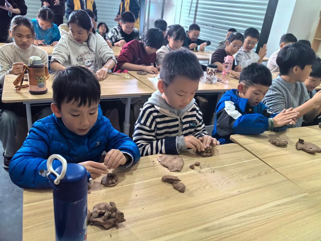 五育场馆则是另一番温馨景象。孩子们围坐在桌前,捧着陶土、花草专注创作,手指捏、搓、揉、压,将作品塑造成各式模样,有的作品虽显稚嫩,却满是想象力。老师在旁巡回指导,不时点头称赞,孩子们脸上沾着陶土也不在意,只顾着专注完成自己的“小作品”,教室里满是安静创作的氛围。