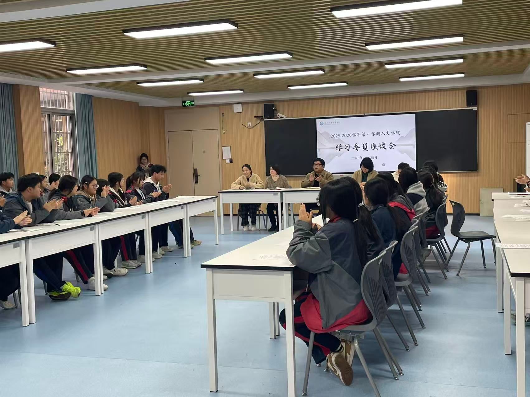11月25日下午,人文学院在求101教室召开了学习委员座谈会。院长周一戈、学管副院长支文婷、教学副院长郑晓琴、学管干事雷彬和教务员熊桂楿共同参加了会议。全院40个班级的学习委员全部到场,大家围坐在一起,就这半个学期以来同学们在学习、生活中遇到的问题提出了自己的看法。会议由教学副院长郑晓琴主持,她鼓励学习委员们大胆发言,如实反映班级同学的意见,帮助学院改进工作。学习委员们从学院管理、老师教学到日常生活,提出了许多实实在在的建议。