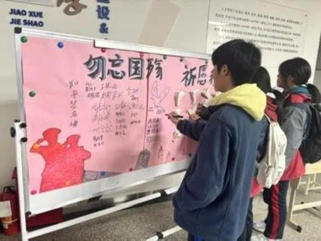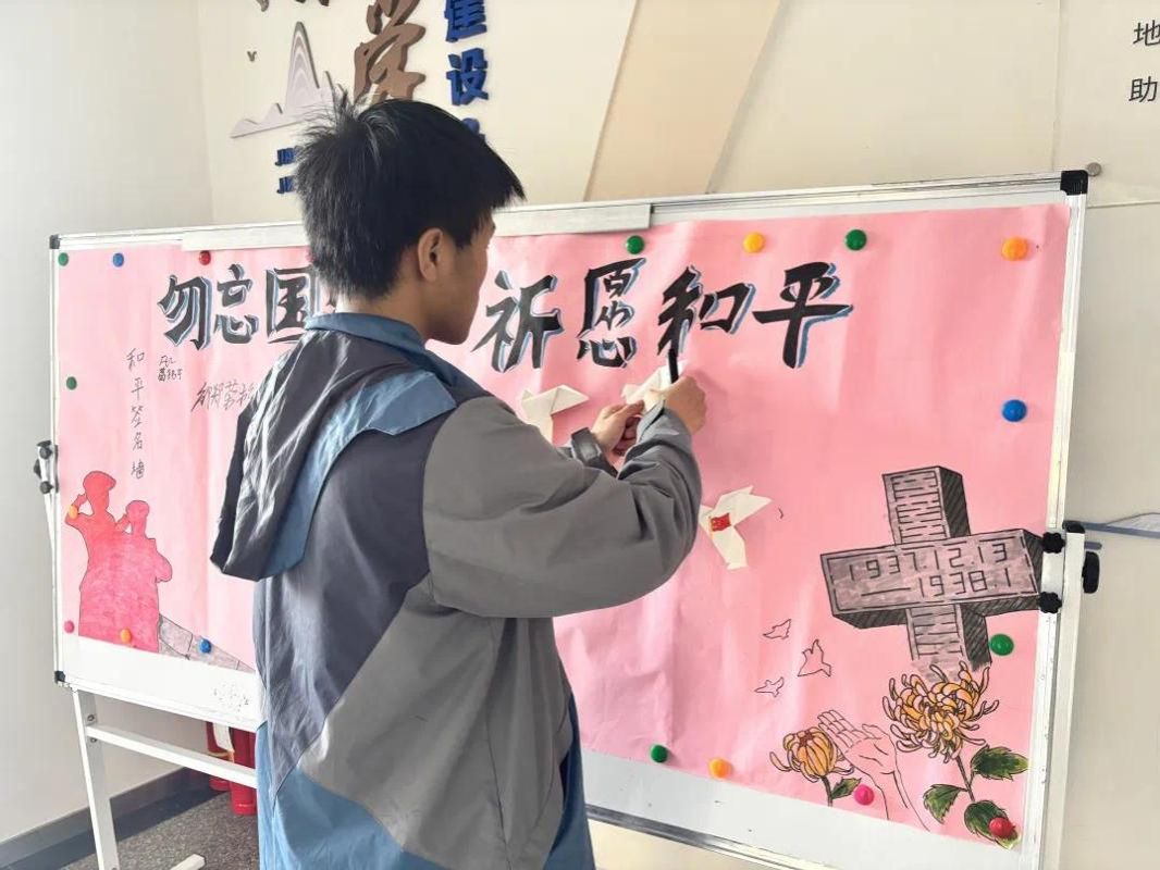 12月14日,温情举行“和平鸽寄哀思”活动。同学们精心折叠象征和平的纸鸽,将对先烈的缅怀、对和平的向往倾注于指尖。一只只洁白的和平鸽被整齐粘贴在公祭日主题海报上。随后,学子们依次在海报上郑重签名,笔尖划过纸面的沙沙声,化作传承英烈精神的坚定誓言。“每一只和平鸽都承载着我们的祈愿,签名是承诺更是责任,我们会把这份家国情怀融入日常学习生活。”2024级学生代表谭同学说道。