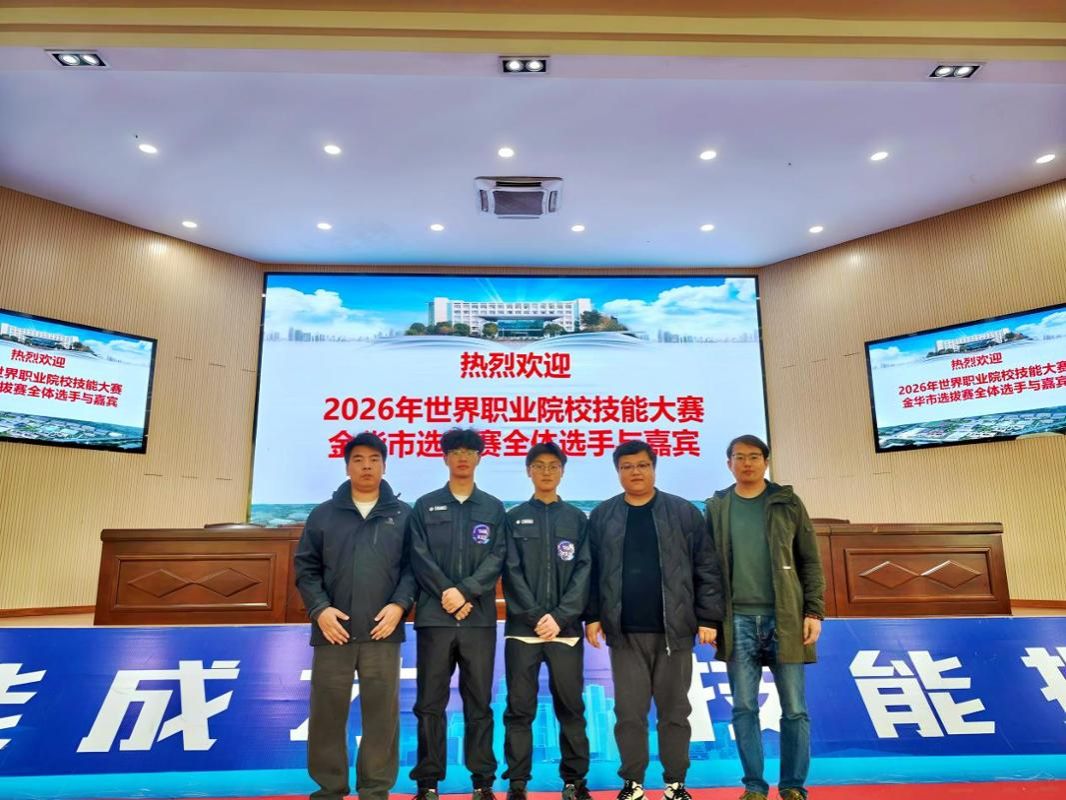 3月15日,2026年金华市中职学校职业能力大赛(学生技术技能类)“新能源汽车维修”赛项在永康市职业技术学校举行,来自全市5所学校共5组选手同台竞技。我校汽车工程学院选手赵顺、姜睿波同学发挥出色,成功晋级省选拔赛。