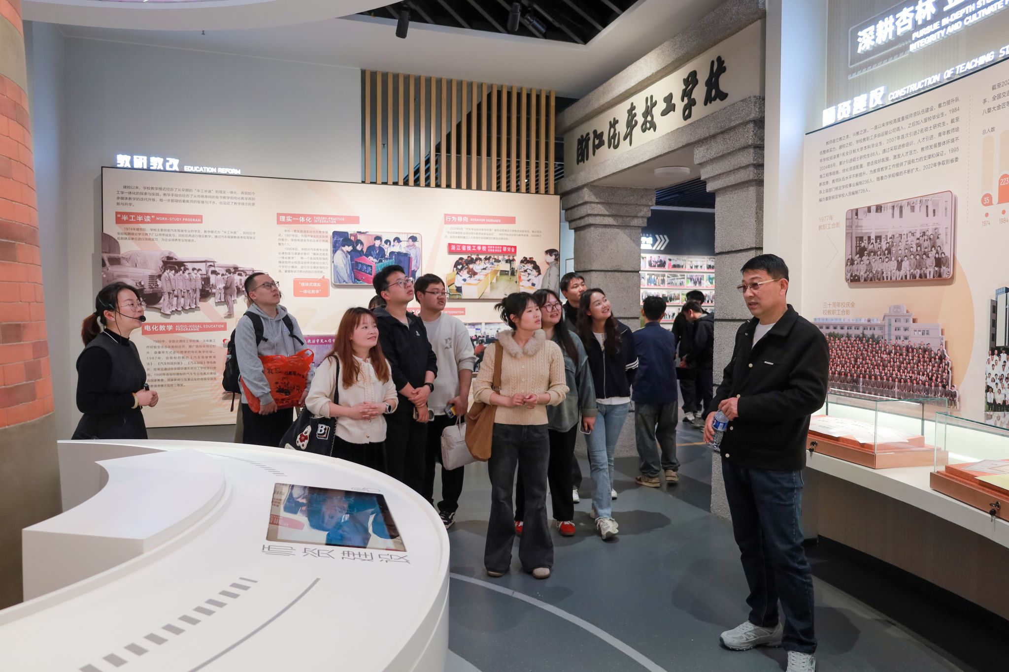 下午,调研团一行先后前往学校花艺馆、婺窑馆、素质拓展基地、育才楼、校史馆、赛车工坊、笃行楼、畅行楼,全面了解学校各专业建设现状、办学历史、校园文化建设及“五育并举”育人模式的实践成果。调研团对学校鲜明的办学特色、完善的教学设施和深厚的文化底蕴给予高度评价。