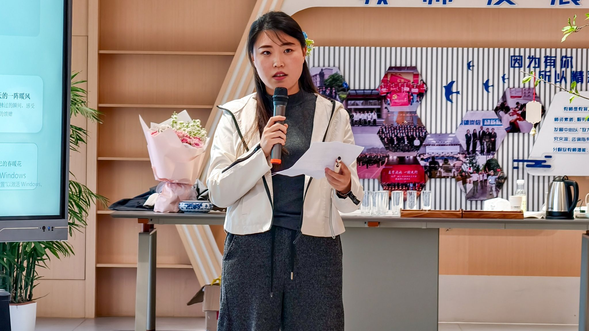 “诗意开放麦” 环节迎来了整场活动的分享热潮,教职工们在读书会现场即兴分享听后感悟,或朗诵珍藏诗句,或倾诉与诗歌的喜爱,还有老师借“苔花如米小,也学牡丹开”表达对职业教育事业的热忱。