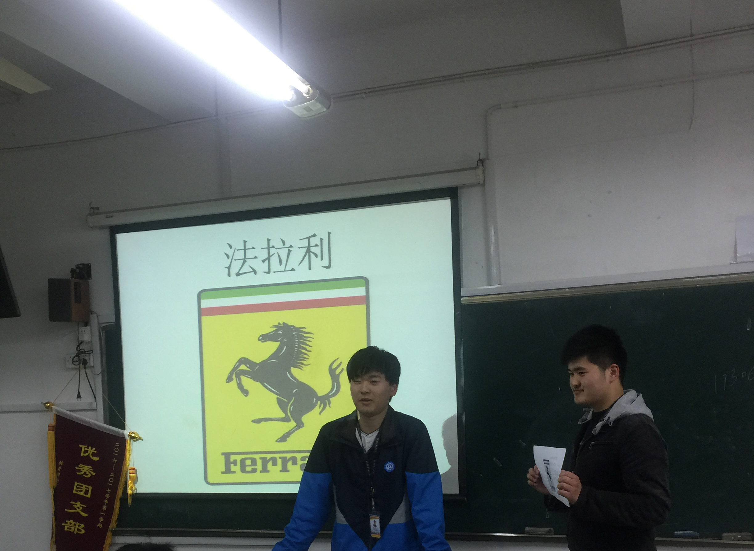 班长郑锦海首先讲述了汽车标识的多样性,随后组织每个小组抽签上台讲述奔驰、法拉利、大众、保时捷等各种品牌车标的含义。每个小组派出两位同学 ,一人举牌一人讲解标志含义及企业文化,整个教室里充满了笑声,大家纷纷表示原来车标有这么高大上的含义。
