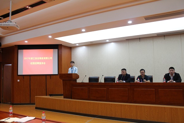 为了推进校企合作,产教融合,为企业选送优秀毕业生人才,根据学院职业教育周活动安排,5月8日下午,信息技术系特邀国家4A级物流企业、中国品牌价值百强物流企业、全国交通运输诚信建设示范物流企业——马帮传奇领航人浙江创运物流有限公司来我院进行校园招聘,浙江创运物流有限公司副总金毅群、人力资源部经理吴斌、人力资源部主管何斌豪、人事专员应思艳、信息技术系主任蒋莘苗、副主任陈春以及信息系现代物流专业、电子商务专业、财会专业师生等共160余人参加了此次招聘宣讲会。
