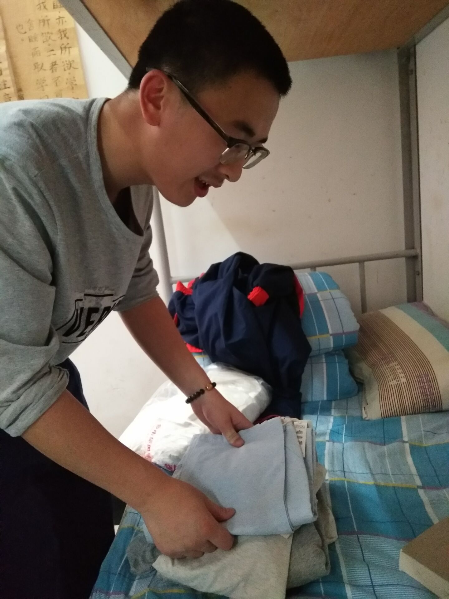高级汽营1601班的袁启明同学当得知有这么一个活动后,就立即联系了父母,想让他们知道离开“避风港”的儿子,是能够独立生活并照顾好自己的。为了给父母展现出自己最好的一面,他立即行动了起来。整理寝室卫生,收拾个人衣柜,积极打扫教室卫生。