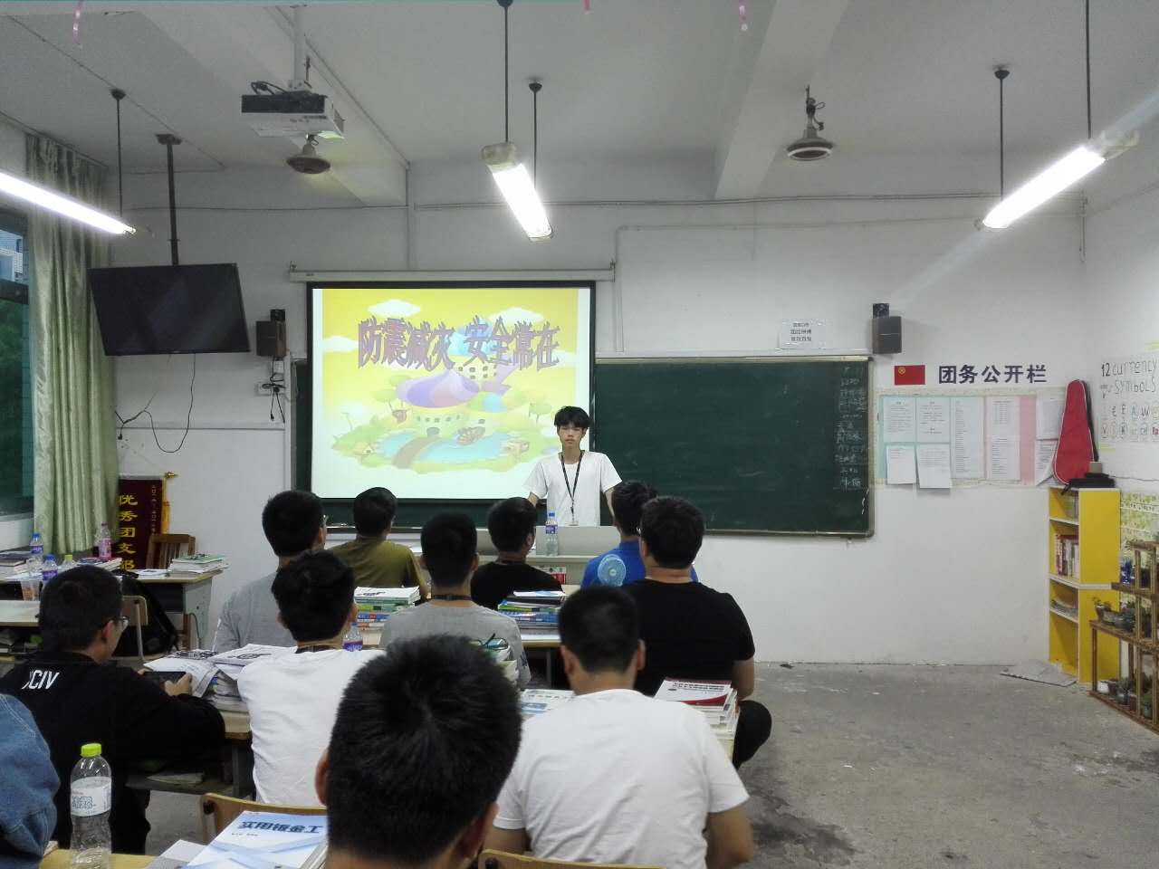 在技师钣喷1601班,团支书赵维迪同学讲述了当时的地震情况,“回顾历程,凝聚心力、“大地无情万民罹难倾血泪;人间有爱,举国同心抗天灾”。同时告诉大家应该防震避灾的注意事项,最后组织大家对逝者的哀悼。