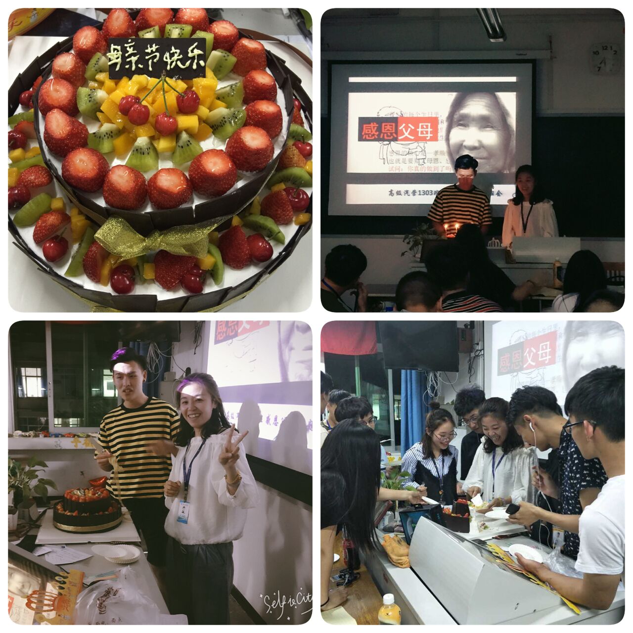 当德育主题班会临近结束时,班委突然端着蛋糕进来,此时班主任有点疑惑?是谁生日吗?这时大家齐声说到:“黄老师,母亲节快乐!”,这着实让黄老师感动到了。高级汽营1303班临近下厂实习,同学们回顾黄老师陪伴大家一起走过来的两年时间,有太多的感动,太多的温暖,姐姐黄老师就像妈妈般无时无刻心系着同学们。