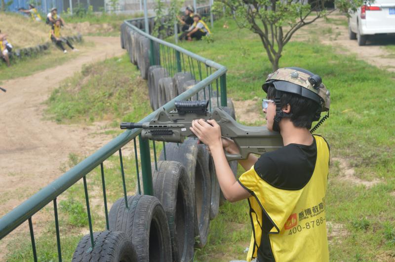真人CS野战是一种集运动与游戏于一体,紧张刺激的高科技娱乐活动。同学们一到基地,在教官的指示下穿戴上装备,并在规定的时间内迅速确定了各自队伍的队长、队名、队歌及标志性手势。整个拓展活动分为三个阶段:第一阶段进行唱队歌比赛,余凯悦为队长的蓝队以豪迈雄壮的《男儿当自强》先赢一局;第二阶段进行队员个人挑战,考验的是队员的个人反应能力,结果以洪川为队长的黄队扳回一局;第三阶段是三局两胜制的野战,一方守另一方攻,整个拓展过程非常激烈.....男生们的豪情如天上的骄阳:似火!