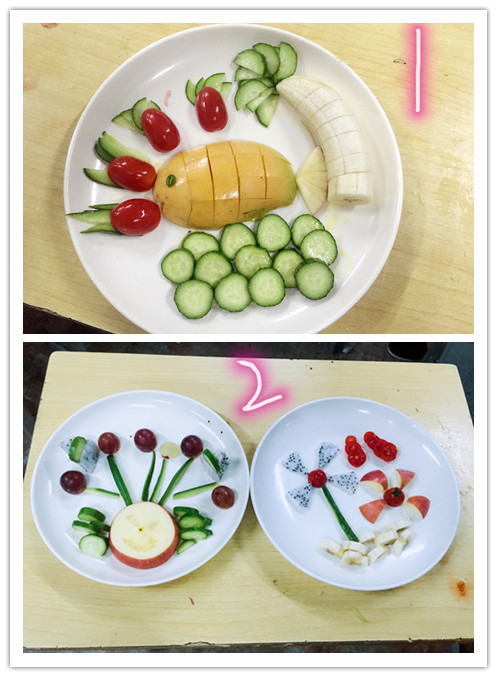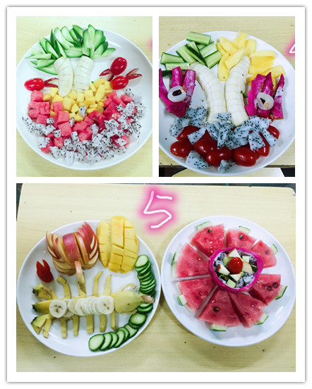 活动前,班主任方科老师和各班干部做了充分准备工作。活动现场气氛热烈,同学们尽情发挥创意,精雕细琢,他们或切、或拼、或雕、或挖,忙得不亦乐乎。在选手们的创意和精雕细琢之下,西瓜、苹果、香蕉、火龙果等各式水果,被改造成片、丁、丝、块等形状,拼放成各种图案。