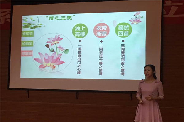 李颖老师首先进行了十分钟的现场说课展示,从独上高楼说亮点、衣带渐宽说思路、众里寻他探过程、蓦然回首谈思路四个方面,展示其获奖说课作品《荷塘月色》。精美的古风画面、精湛的ppt技术、新颖的思路、独特的切入点,以及语文与专业的高度结合,给在场各位老师带来了视觉和听觉上的震撼。