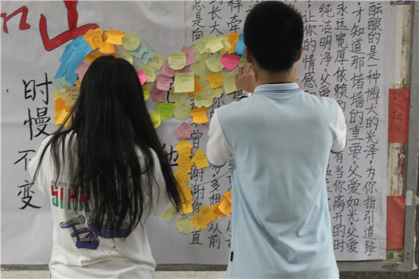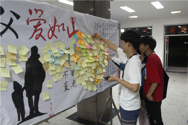在求是楼大厅的展板上贴满了便利贴,满满的便利贴围成了爱心形状,上面写着同学们给父亲的寄语:“爸爸,父亲节快乐,不要那么辛苦,祝您一天比一天轻松!”,“爸爸,虽然你很凶的,但我知道你是爱我的,在这里祝您健康快乐!”“爸爸,吸烟有害健康,为了身体,您就少吸两支烟吧。”……简单朴素却又是最真挚的言语,无不透露出同学们对父亲深厚的爱。