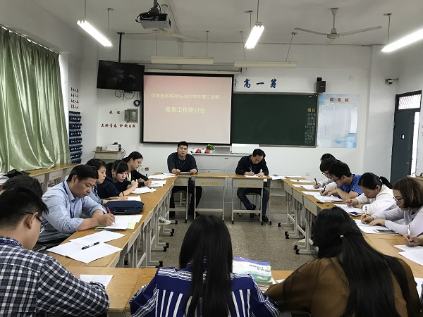 6月16日下午,信息技术系在行知楼302教室召开本学期班主任工作研讨会,信息技术系蒋莘苗主任、陈春副主任和系全体班主任参加了会议。会议由陈春副主任主持。
