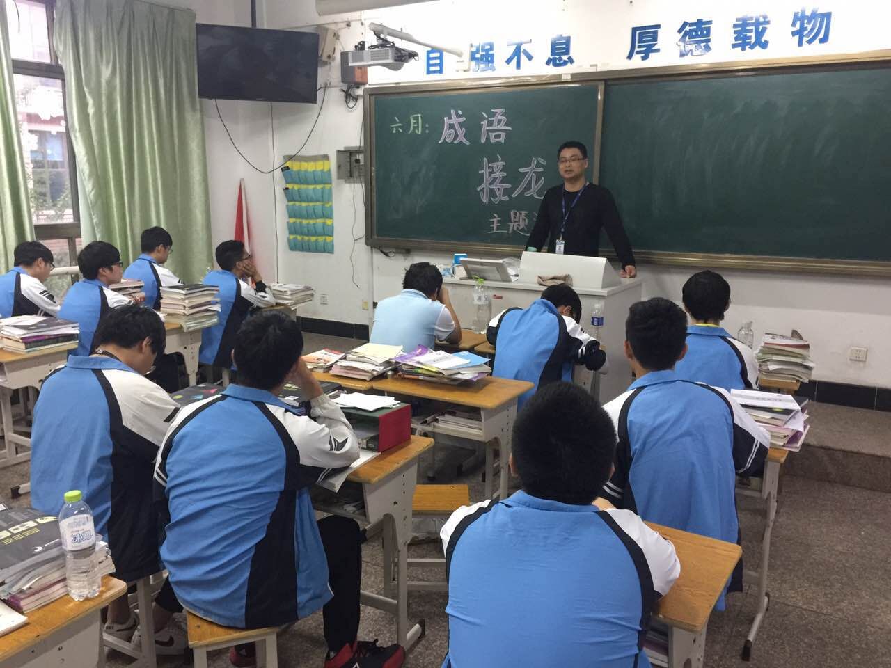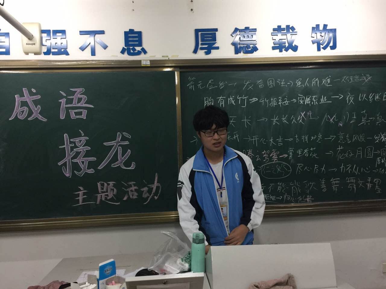 6月14日晚自习,技师模制1501班开展了成语接龙的班级活动。首先先由班主任潘老师在黑板上写一个成语:胸有成竹,然后同学们按照座位顺序依次在黑板上写出下一个成语,“竹报平安—安居乐业—夜以继日—日久天长…”现场气氛异常活跃,一开始,同学们都能随口说出许多成语,但随着词龙的不断加长,难度也在增加,到最后有3名同学因为连续2次没有接出成语而落败。开展成语接龙的活动,是希望通过这个游戏,大家可以拓展思维同时加强大家对于成语的记忆程度,并且在这个游戏中又可以做到互相交流,互相学习。