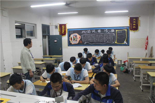 基础部后进生学习班由郑世成老师负责,郑老师根据自己多年的经验,不断地反思、总结,在后进生转化方面总结了一套行之有效的方法。他说到,他采取的方法一是严慈并济,宽严有度:对于大部分后进生,是以饱满的热情,慈母般的爱心去感化他们,促使他们产生自愧自责之心,从而主动改正错误;但是对待那些思想比较顽固和霸道的学生,必须义正词严地表明自己的立场和观点,震慑一下其邪气,并给予适当的惩罚,如抄写学生手册,既可以使其思想上受到震动,又可以让他们体会到老师的良苦用心。方法二是及时了解,跟踪辅导:主动与后进生沟通,谈心,了解他们犯错的原因,主动进行关心,给予帮助,从细微处去扭转、矫正他们的行为习惯,同时课后通过各班班主任、各班同学,跟踪了解后进生后续情况,与班主任共同辅导、反复教育,从而使转化工作顺理成章,水到渠成。