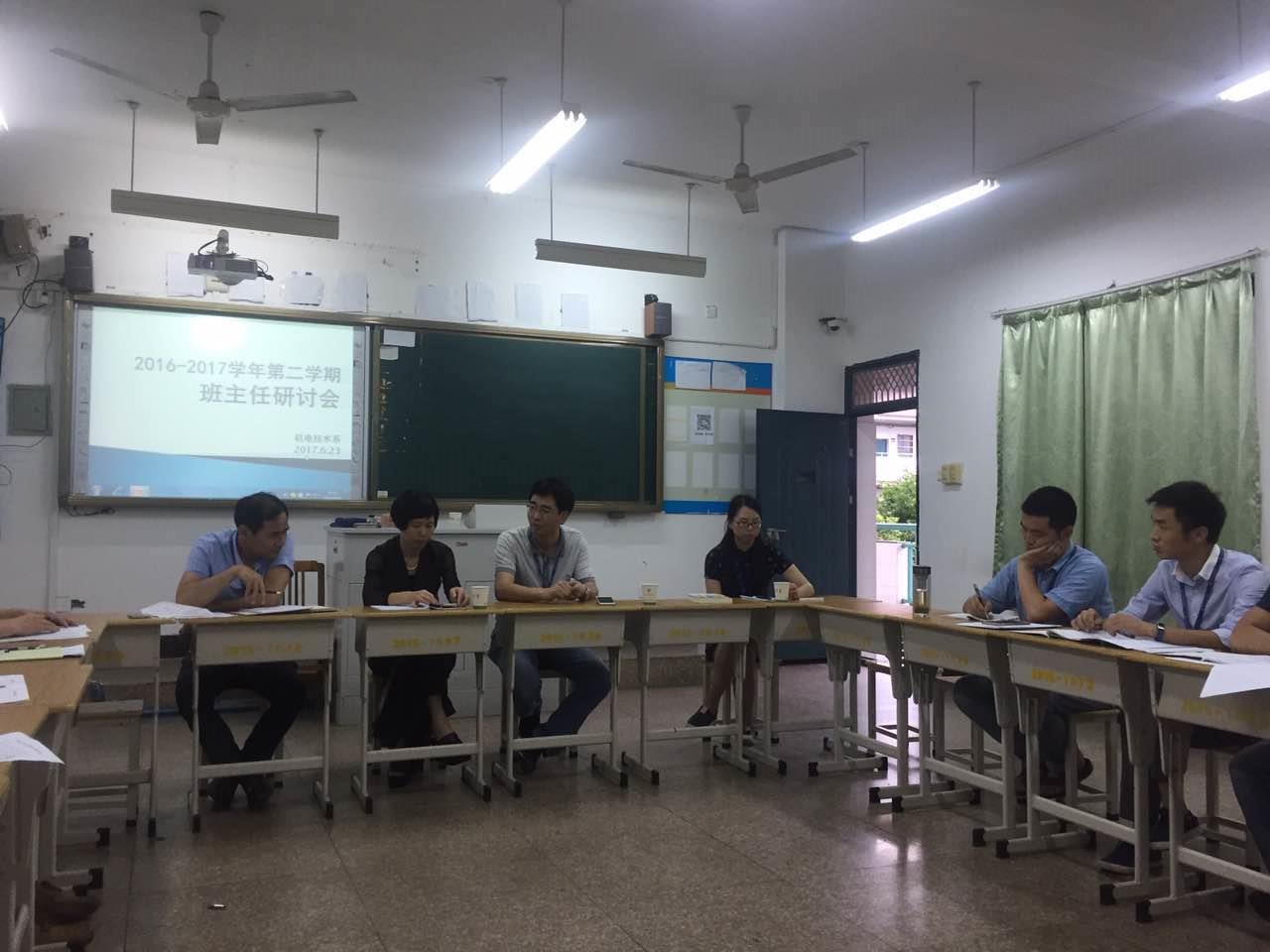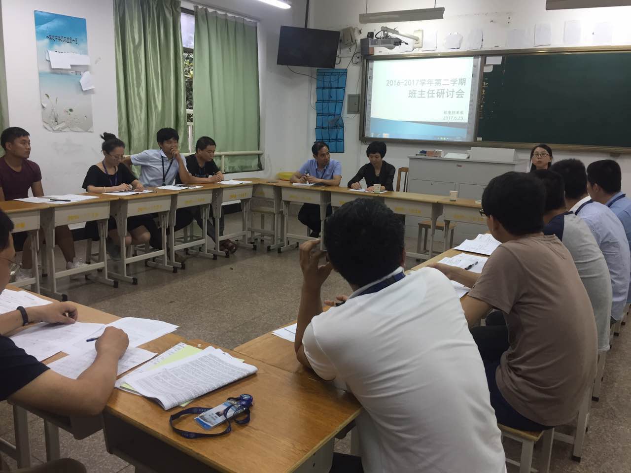 为了让班主任们能更好的开展班主任工作,也为了让班主任之间能对工作经验和心得体会进行相互交流和学习,6月23日下午3点,机电技术系在行201教室开展了班主任工作研讨会活动,校学生处处长叶智勇、学生心理辅导老师马菲菲、机电技术系主任宗冬芳、系学管干事盛景东和18位班主任参加了此次研讨会。
