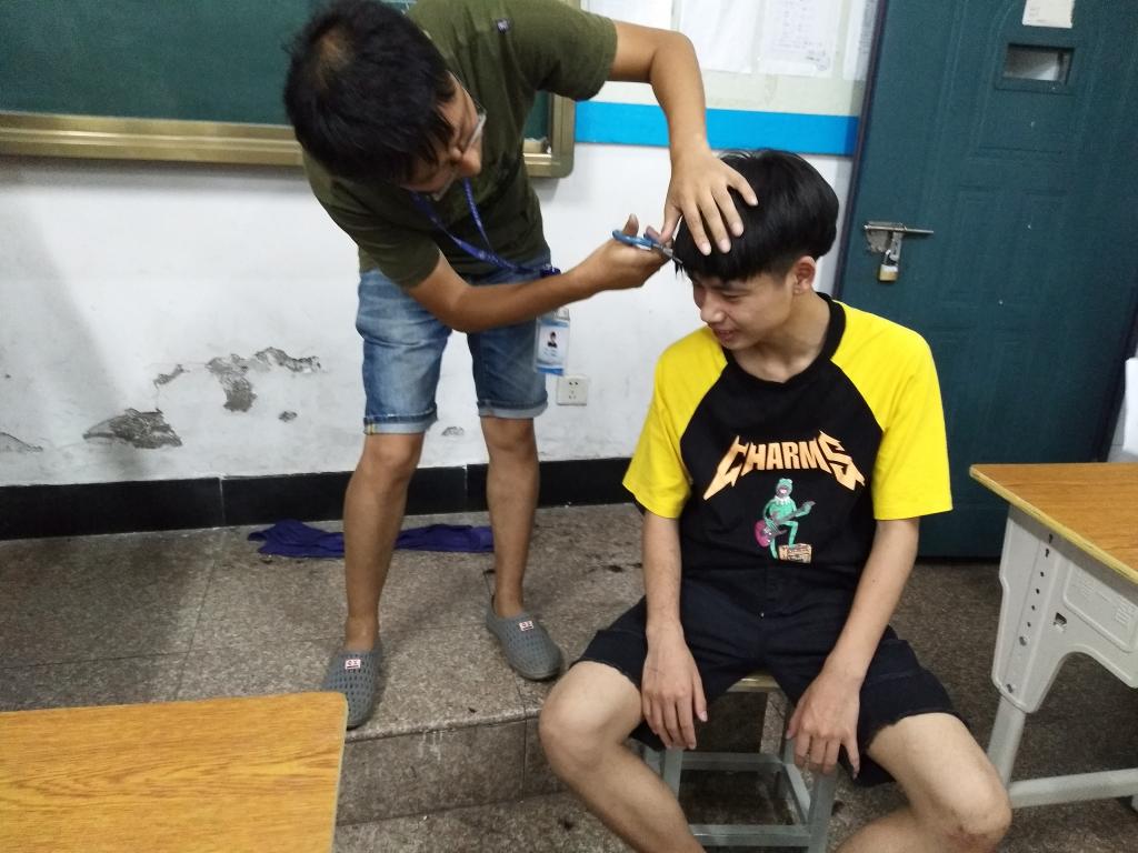 正值军训时期,初入学院的基础部新生们个个换上了军装,在教官的训练下已然有个军人该有的样子。可不乏有一些新生仍保持着旧模样,那散乱的长发和泛黄的发色不免在行伍队列之中有些出众。于是“二月春风”一般的基础部班主任老师们亲自执剪,为发型不合格的同学们“裁出”了干净利落的短发。或许在抛掉那旧面孔前一些同学仍有抵触,可是“改头换面”后的他们对新发型并不排斥。也许班主任老师并没有专业理发师那样的精湛技艺,但是可以从这干净利落的短发中看出老师对学生的关爱。