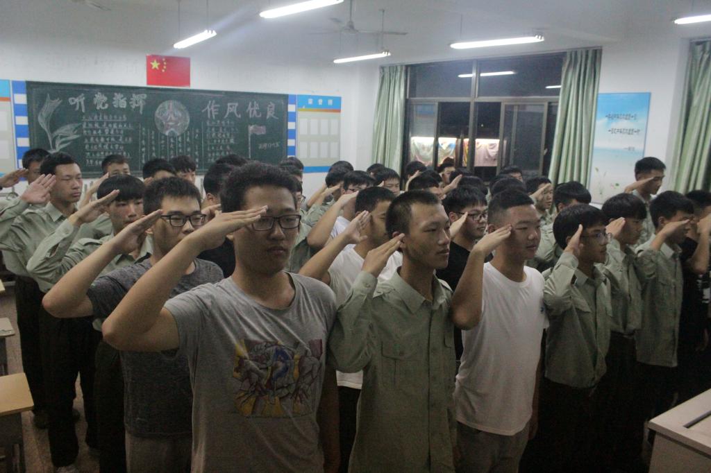 军训的生活有苦涩也有甘甜,有沉闷也有欢乐。如果说平时的操练是一项累人的活动,那么在教室学唱军歌就是一场轻松消乏、极具趣味性的活动。每晚,基础部新生在教官的指导下,在教室学唱军歌。