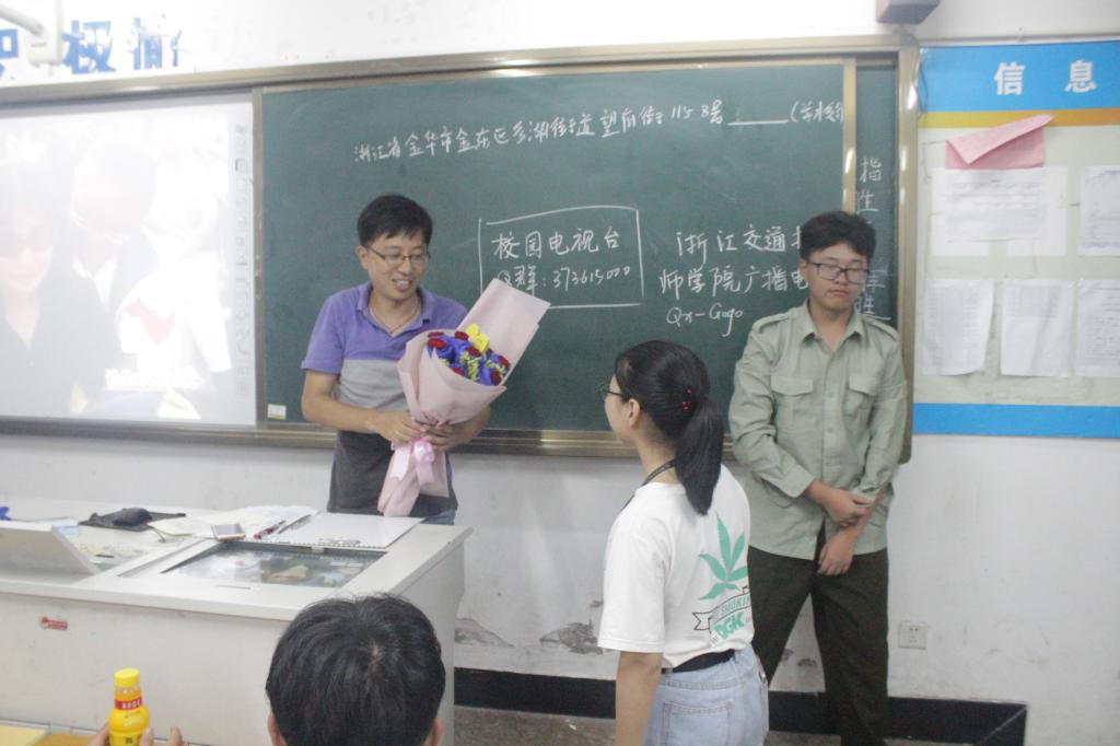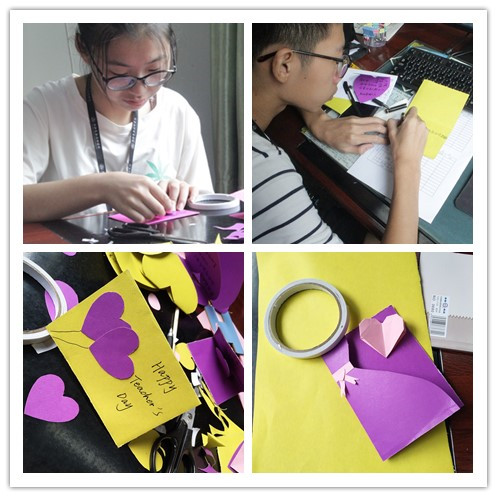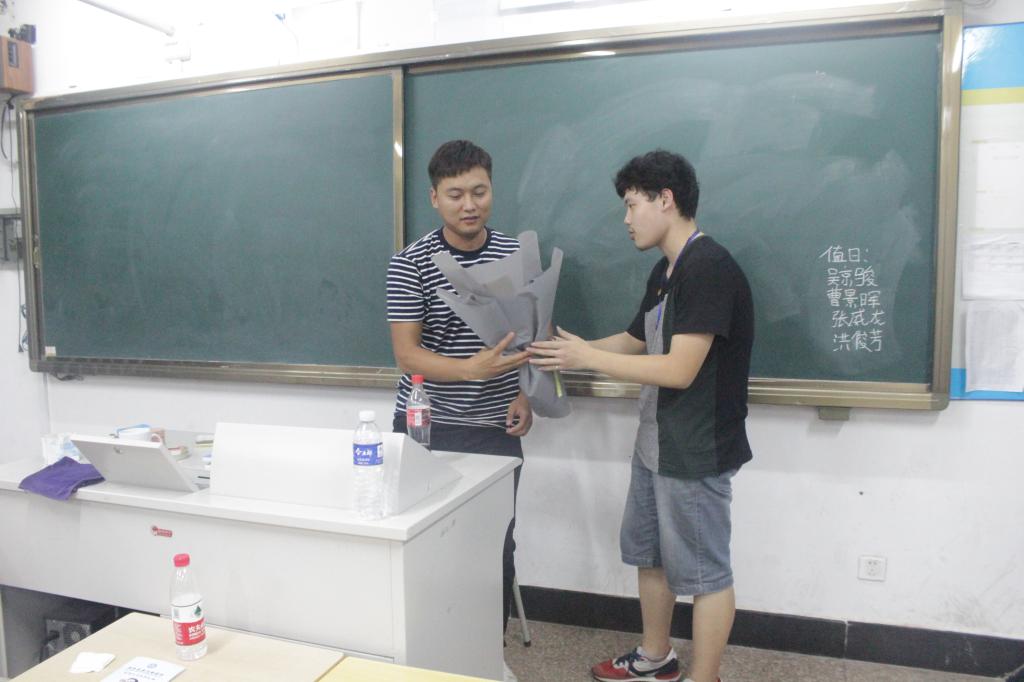 基础部的各位团学干部用彩色卡纸制作了精美的贺卡并写上真挚的祝福语:“亲爱的老师,您辛苦了”或“老师,我们感谢您”或“老师,我想对你说……”,字里行间透露着对老师的敬意和感谢。当学生干部代表将鲜花和贺卡递给老师时,老师严肃的脸上堆满了笑容。这份祝福让老师们倍感欣慰,连日来早出晚归的艰辛、烈日灼伤和汗水浸湿的疲惫都烟消云散了。